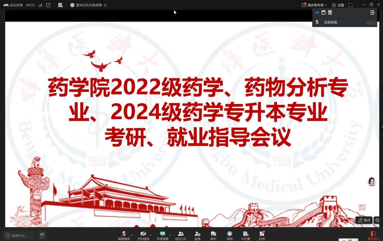 为帮助2022级药学、药物分析专业及2024级药学专升本专业学子破解考研报名难题、明确冲刺方向,平衡实习、就业与考研关系,10月11日晚,毕业年级辅导员夏坤以线上形式召开专场指导会,并特邀已录取南京医科大学的王雨蒙同学分享经验。