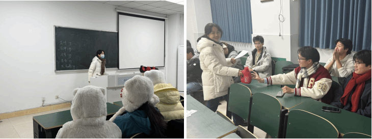 活动在欢快的氛围中展开。首个环节“猜数字”游戏中,主持人在0-200范围内设定数字,同学们踊跃举手、大胆猜测,现场提示声与欢笑声交织。最终有同学精准猜中,赢得奖品,引来一片喝彩。随后的“你画我猜”环节,同学们两人一组,通过肢体语言和简笔画默契配合,趣味横生的表演引发阵阵笑声,每位参与者均获得了精美书签留念。