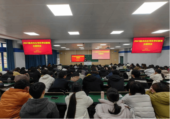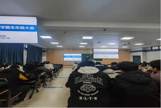 为加强考风考纪建设,明确期末阶段学习与安全要求,12月20日下午,药学院2023年级药学、药物分析、临床药学专业在理论楼101教室召开考风考纪教育主题班会暨期末年级大会。会议由辅导员肖进主持,全体本科生参加。